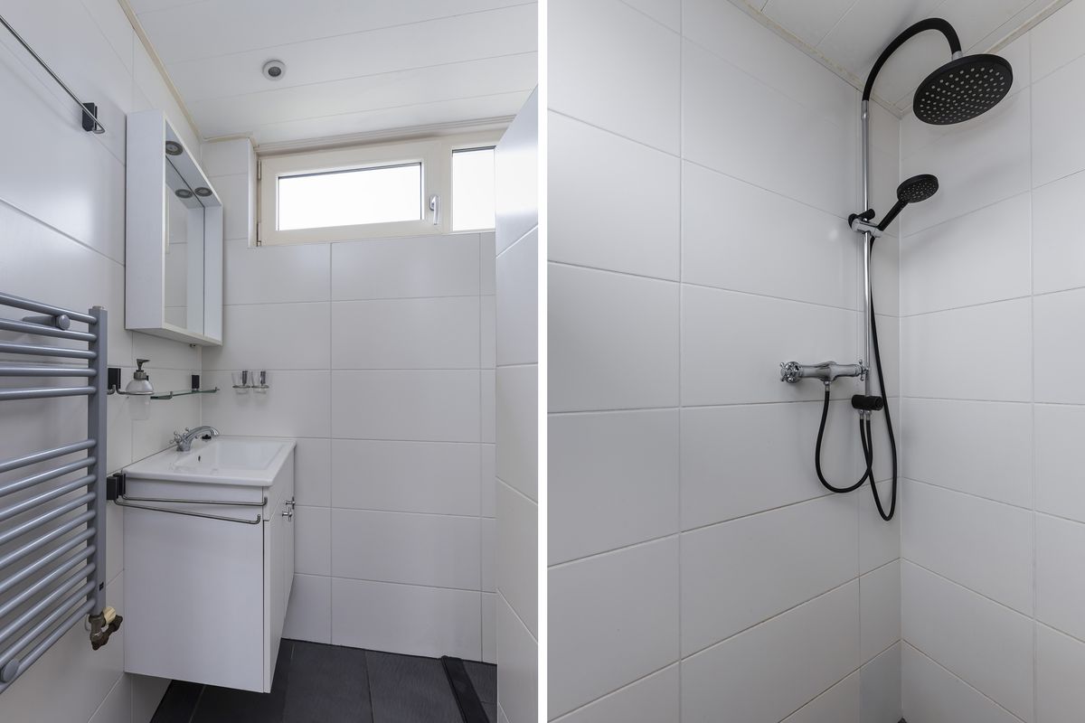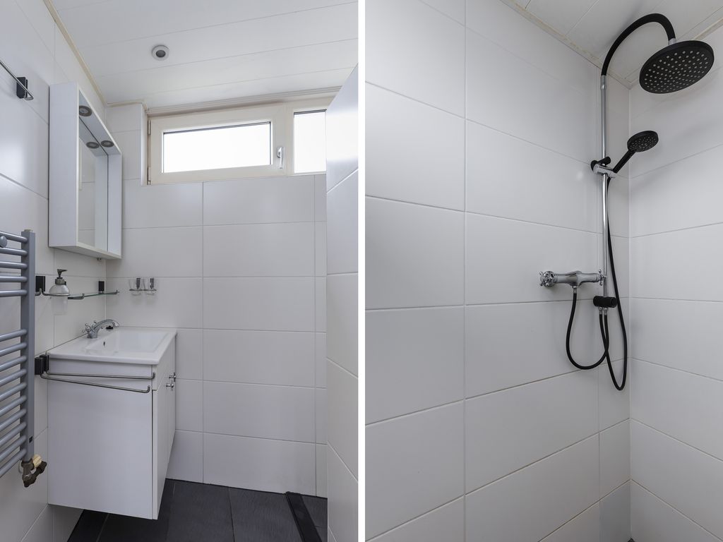 De badkamer (circa 1,47 x 2,02 m) is licht betegeld en voorzien van een inloopdouche en een wastafelmeubel.
