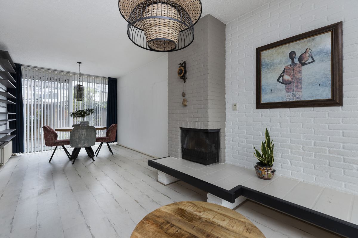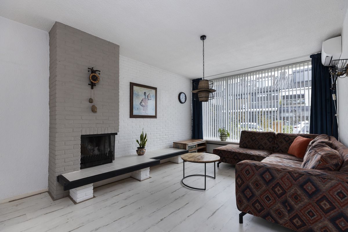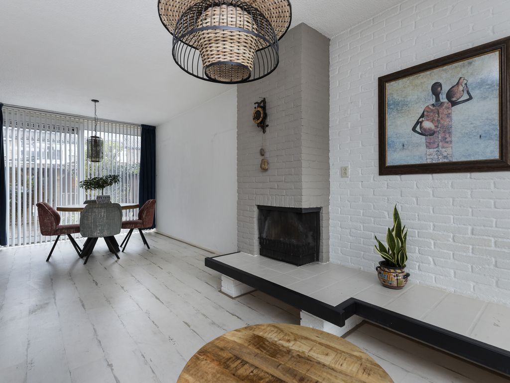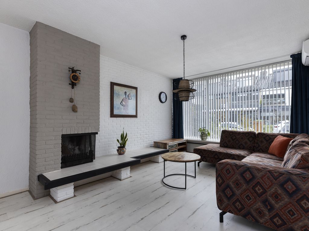 Een sfeervolle open haard, airco en de schuifpui naar de tuin maken deze ruimte tot een fijne living.