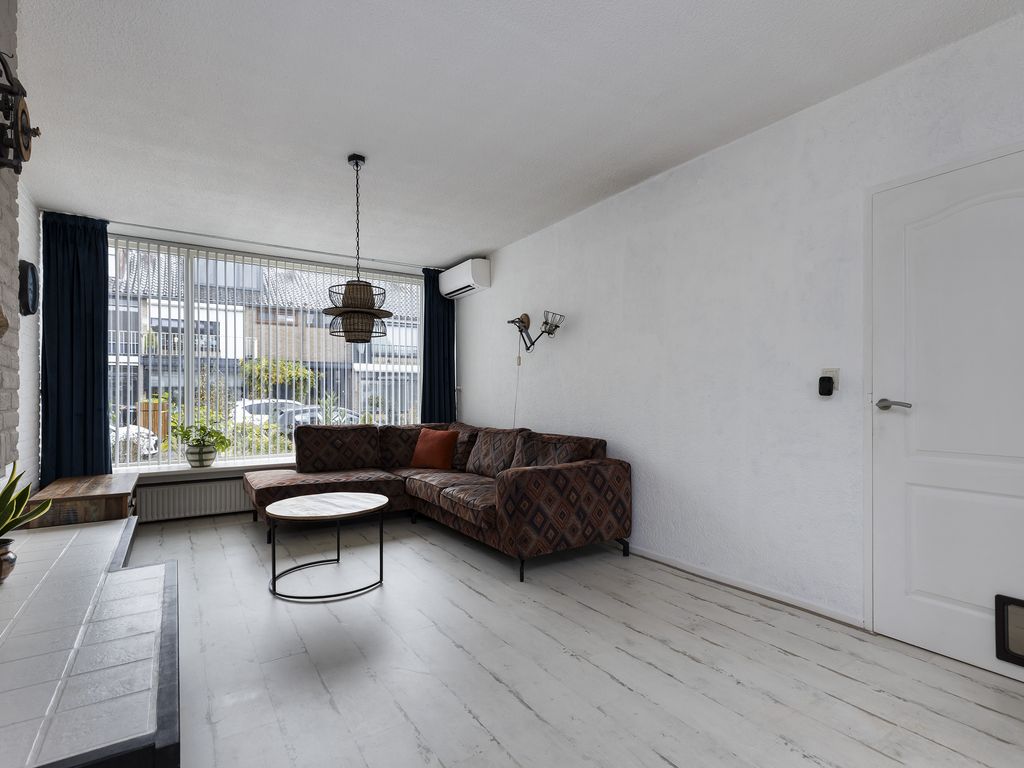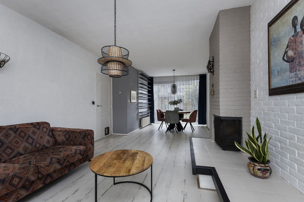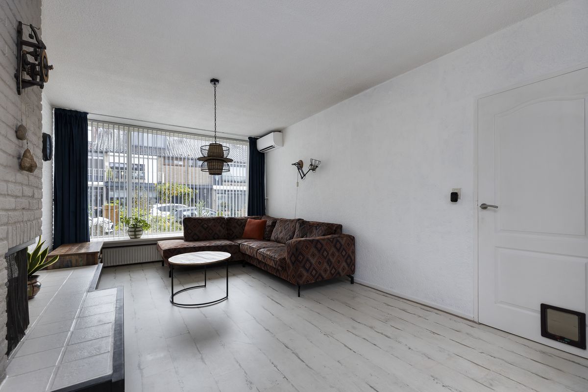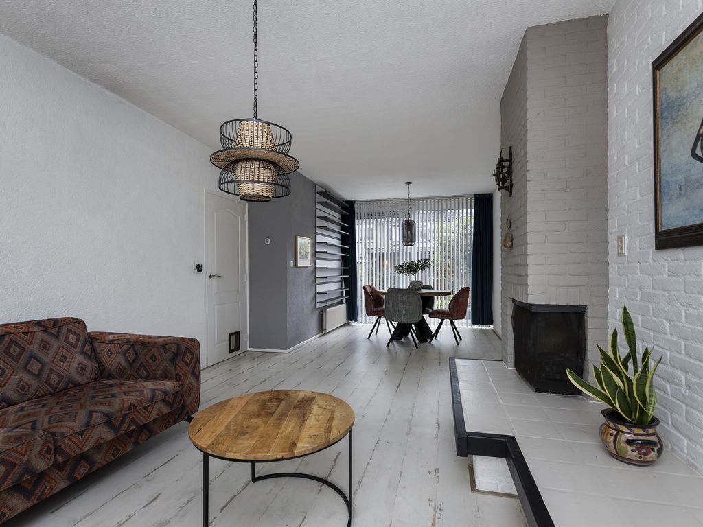 Een sfeervolle open haard, airco en de schuifpui naar de tuin maken deze ruimte tot een fijne living.