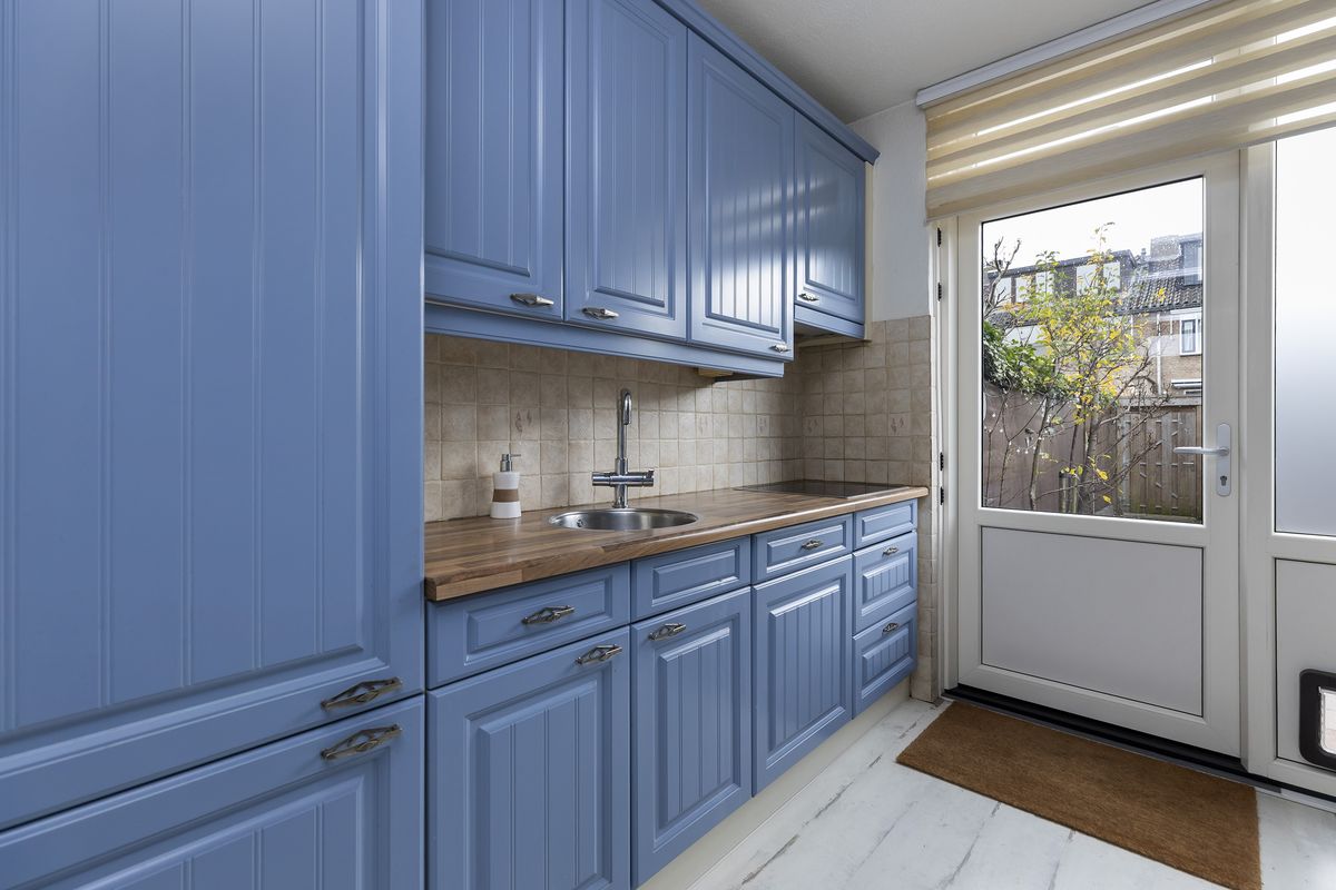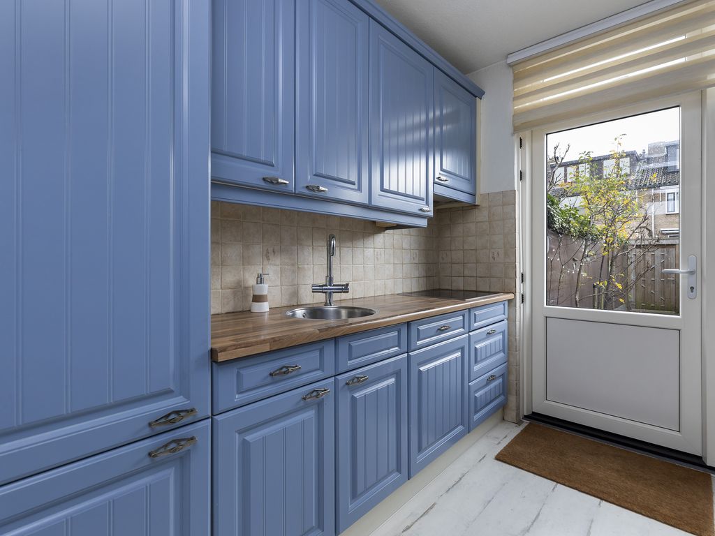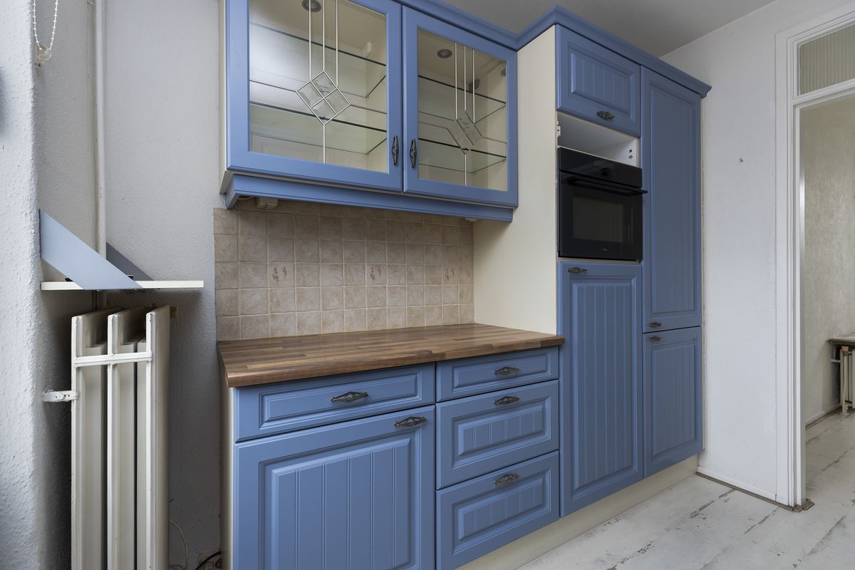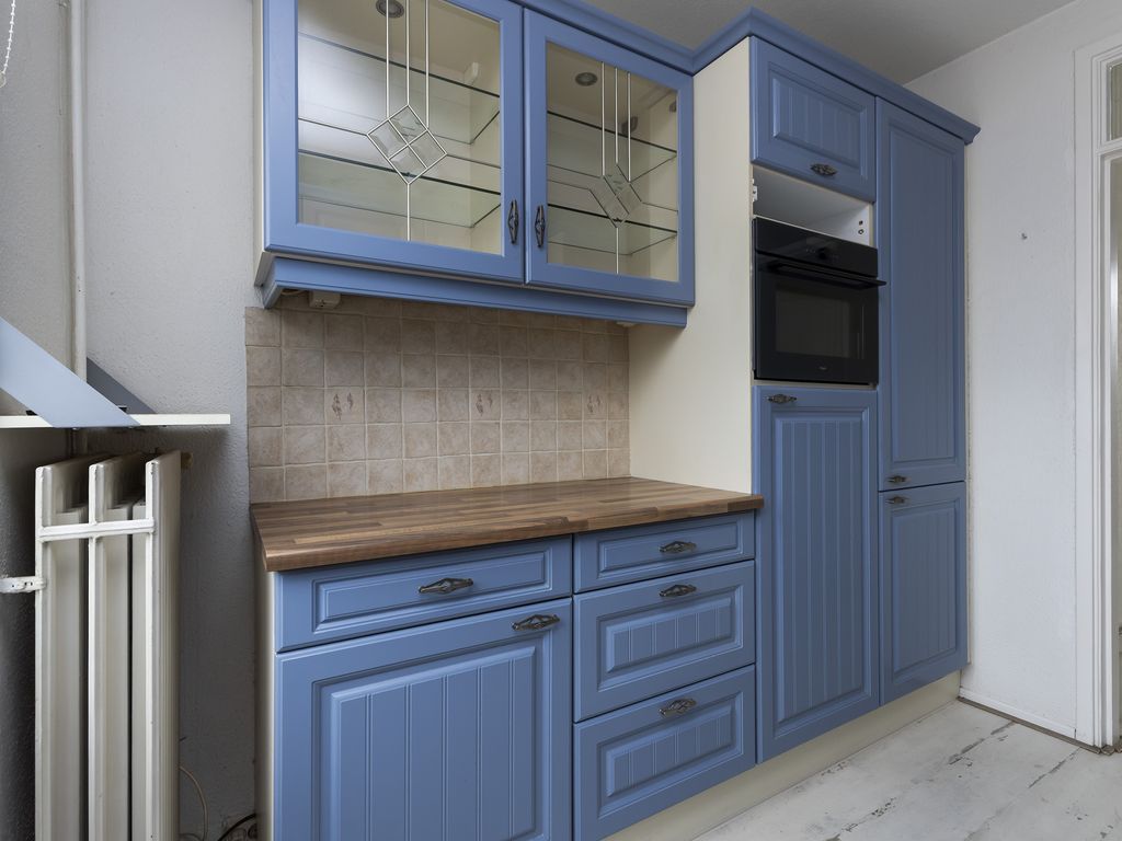 De keuken heeft een afmeting van ca 2,81 x 2,65 m. Deze is voorzien van een verzorgd keukenblok in blauwe kleurstelling aan beide zijden, wat zorgt voor extra werk- én opbergruimte.