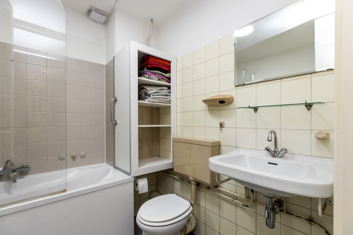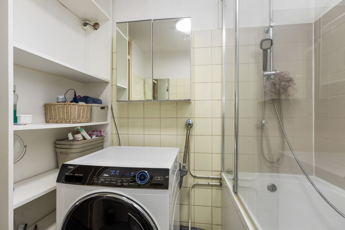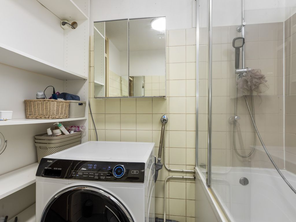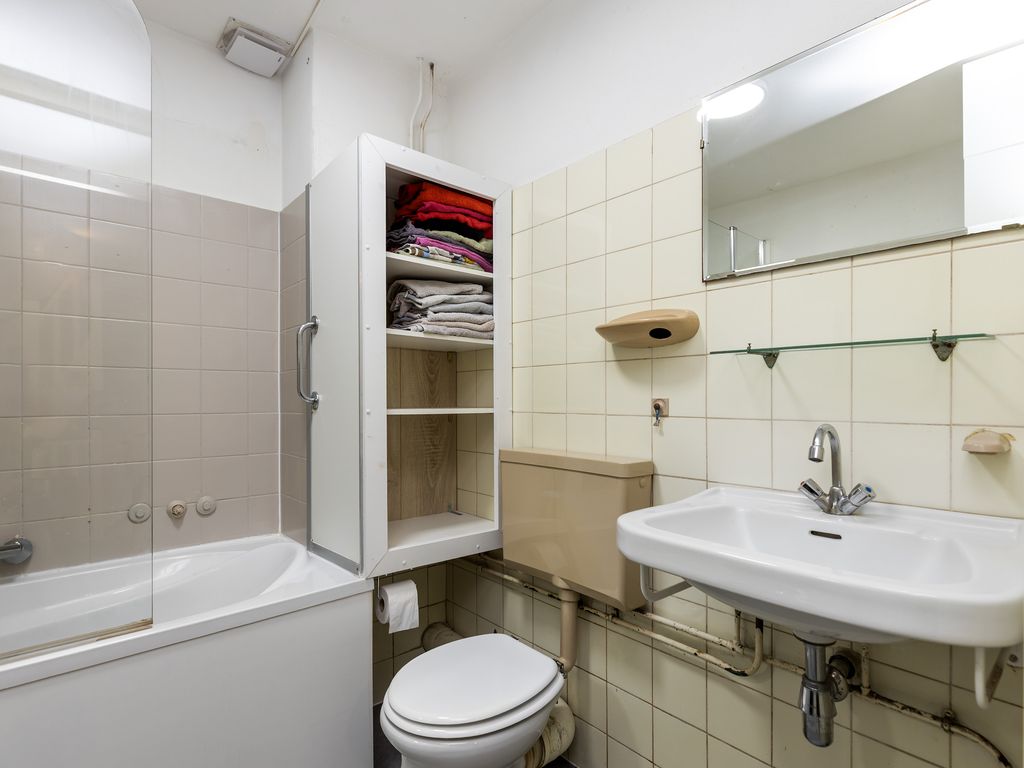 De badkamer (afmeting ca. 2,12 x 2,10 m) is voorzien van een inloopdouche, ligbad, wastafel, tweede toilet en aansluitingen voor de wasapparatuur.
