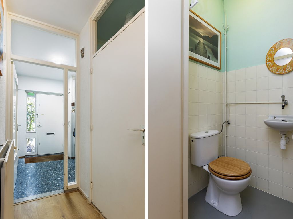 Royale hal met trapopgang naar de eerste verdieping, toiletruimte, trapkast en toegang tot de woonkamer.