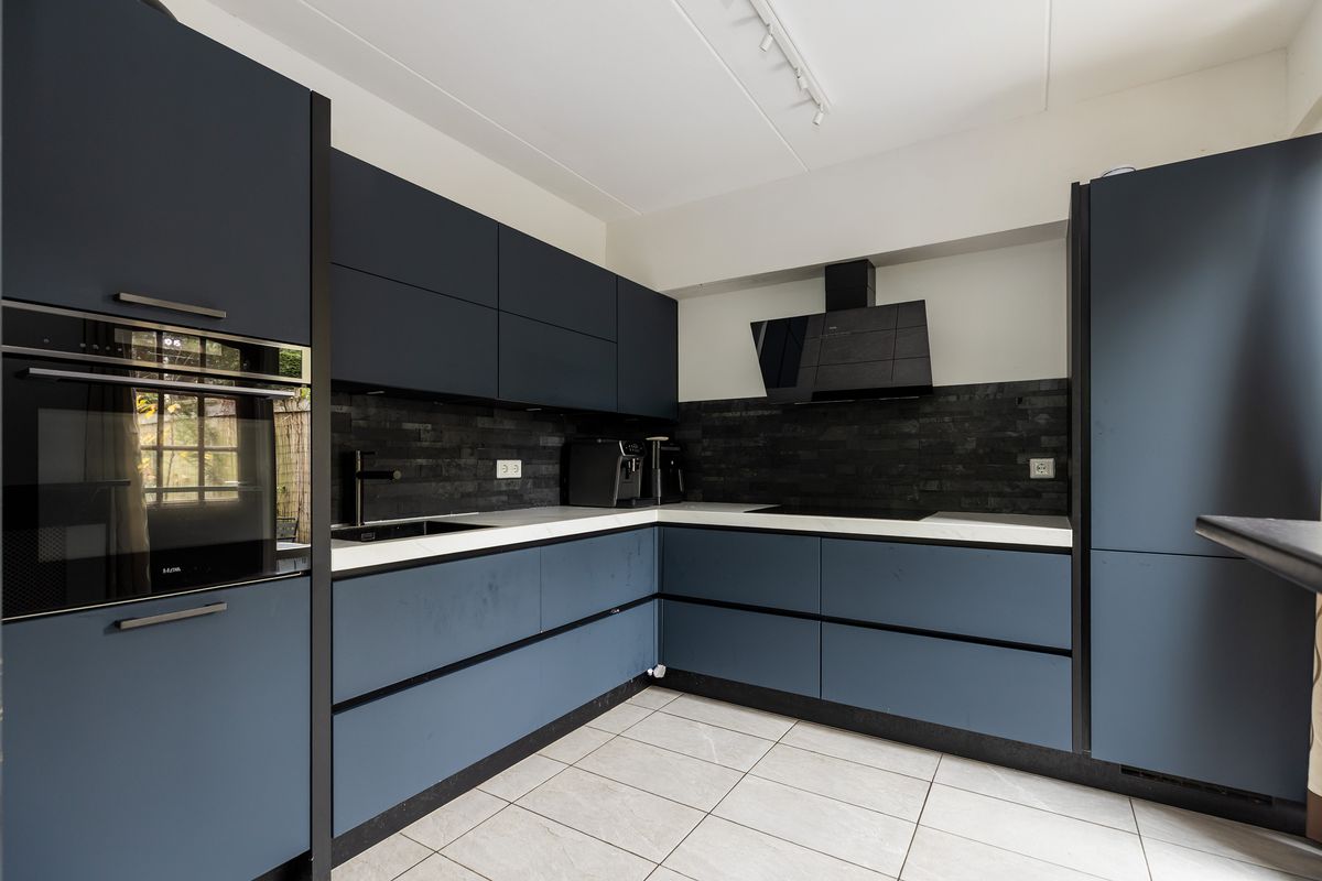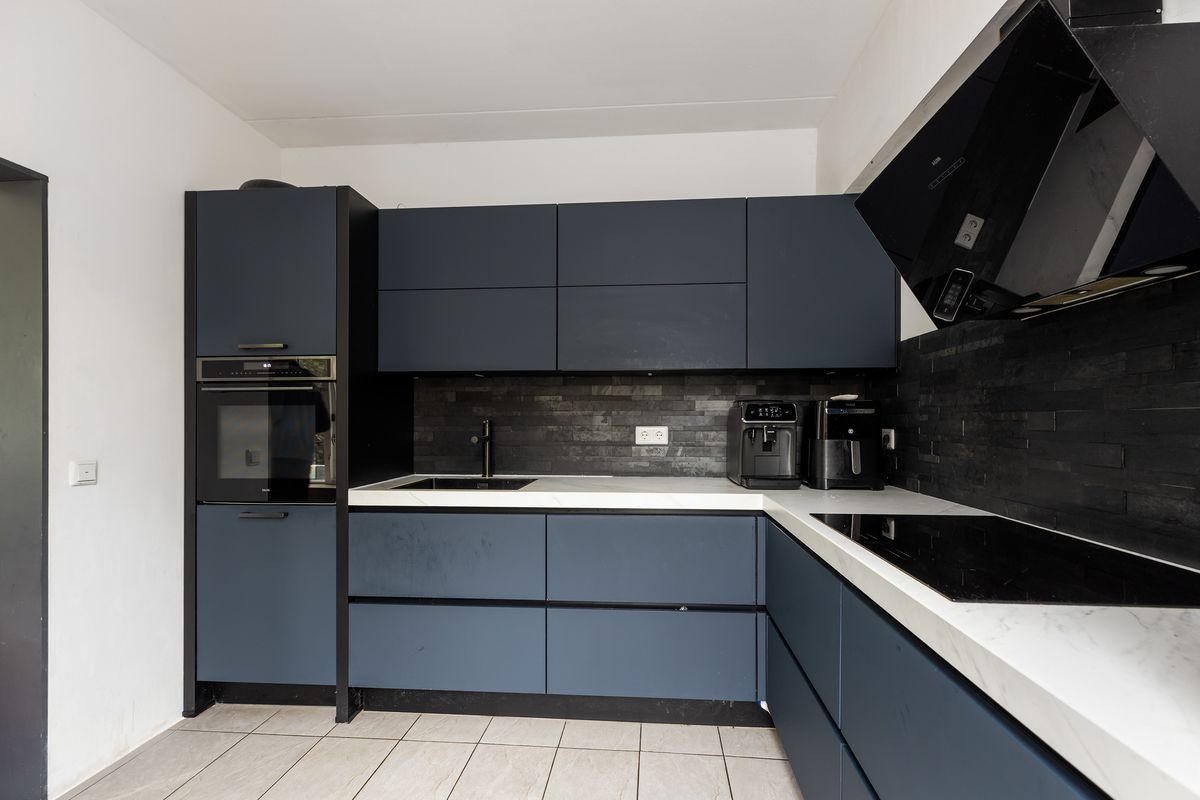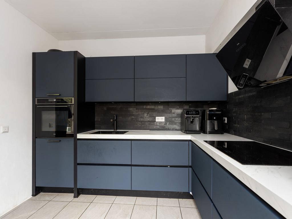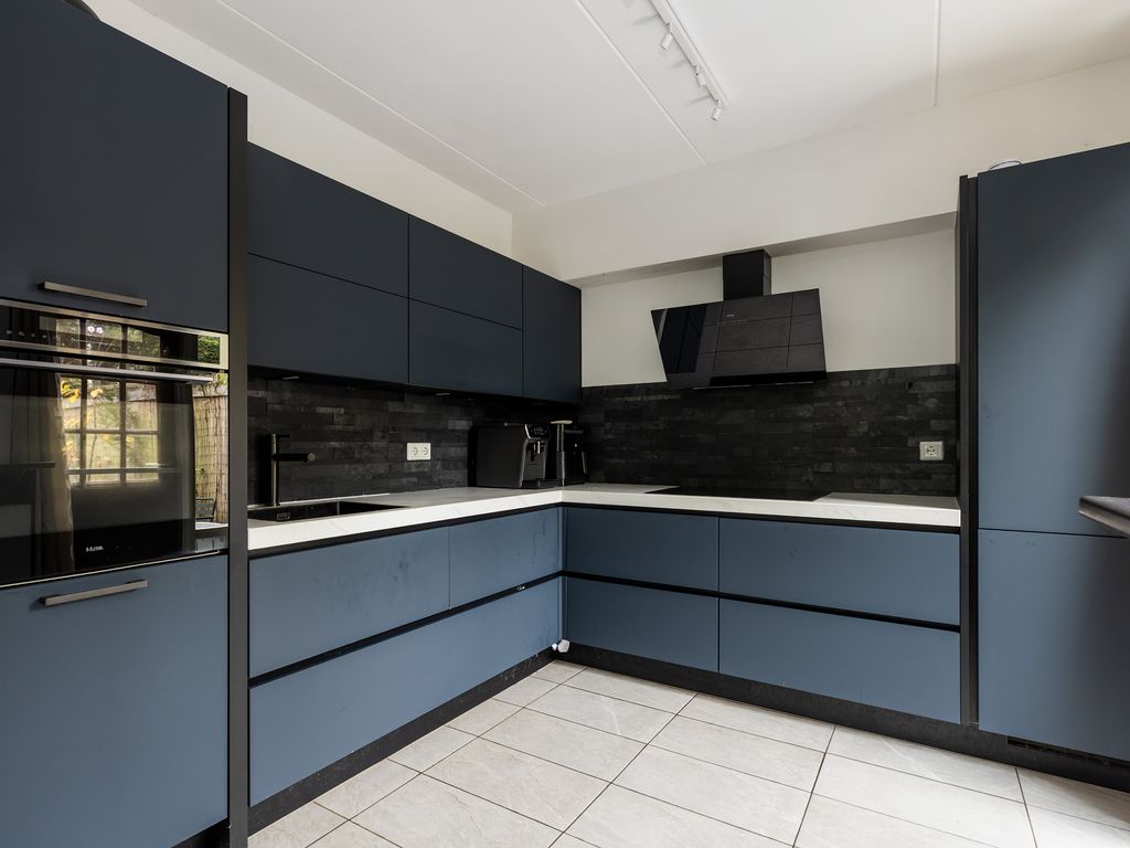 De moderne open keuken (2023) bevindt zich aan de achterzijde van de woning en is uitgevoerd in een hoekopstelling voorzien van inbouwapparatuur: