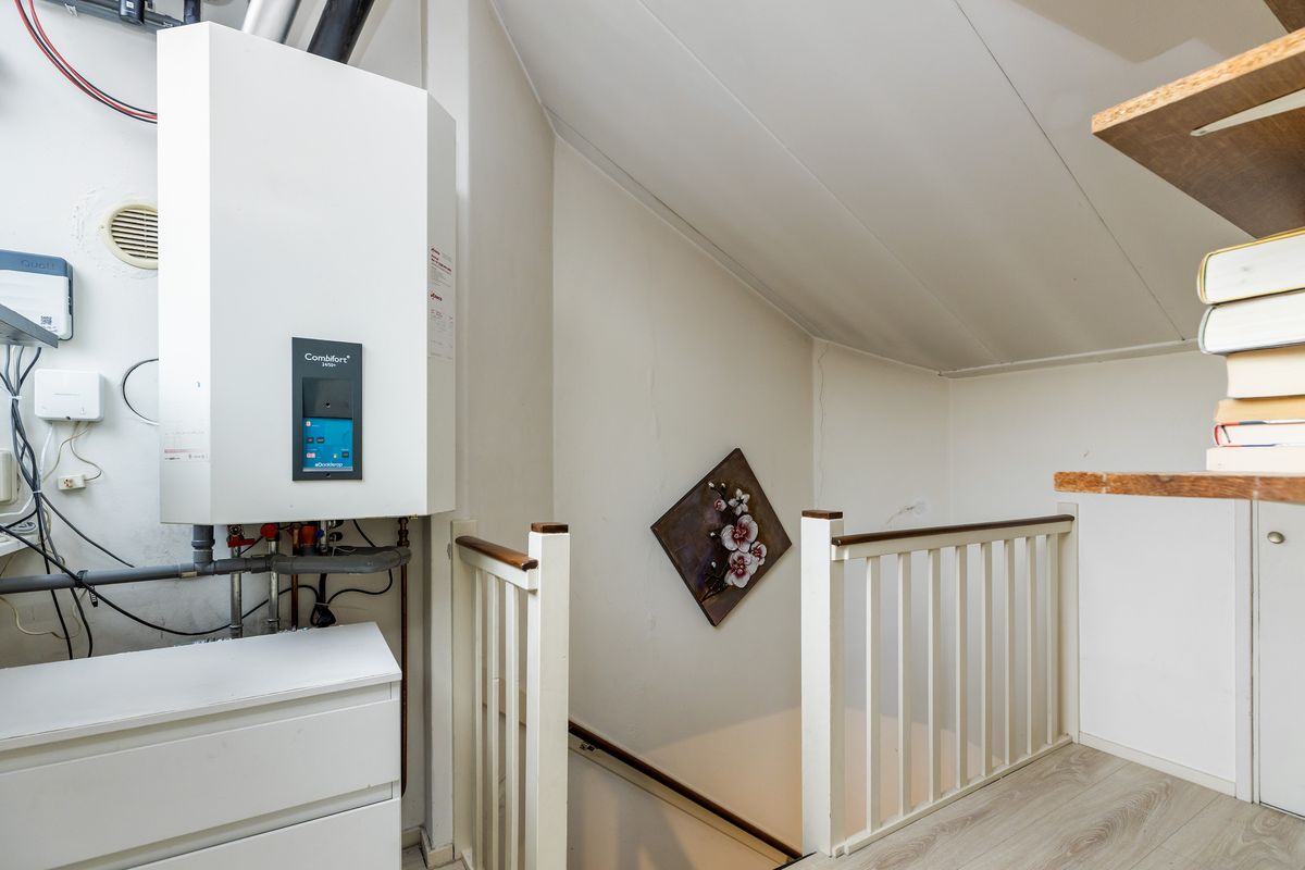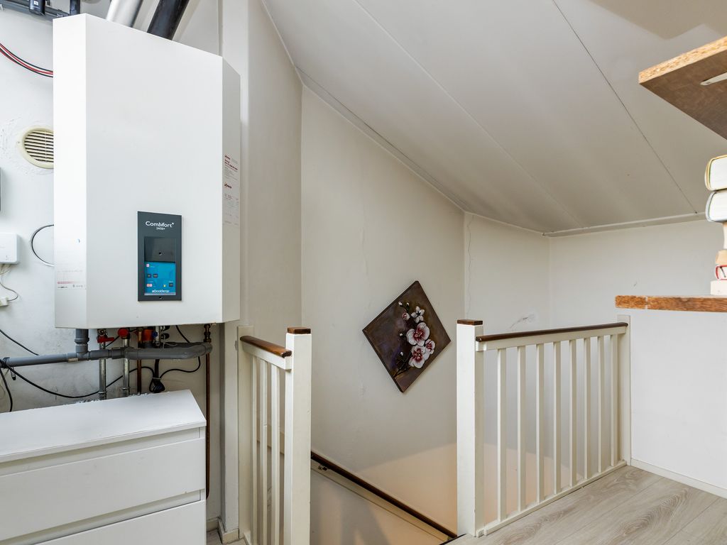 Ruime overloop met opstelplaats voor de cv-ketel, omvormer zonnepanelen en volop bergruimte onder het schuine gedeelte van het dak.