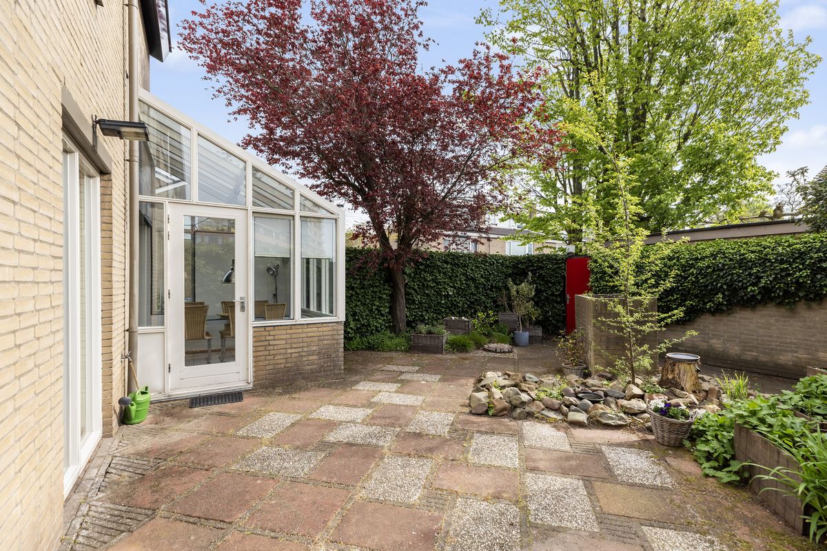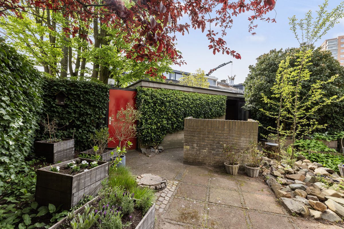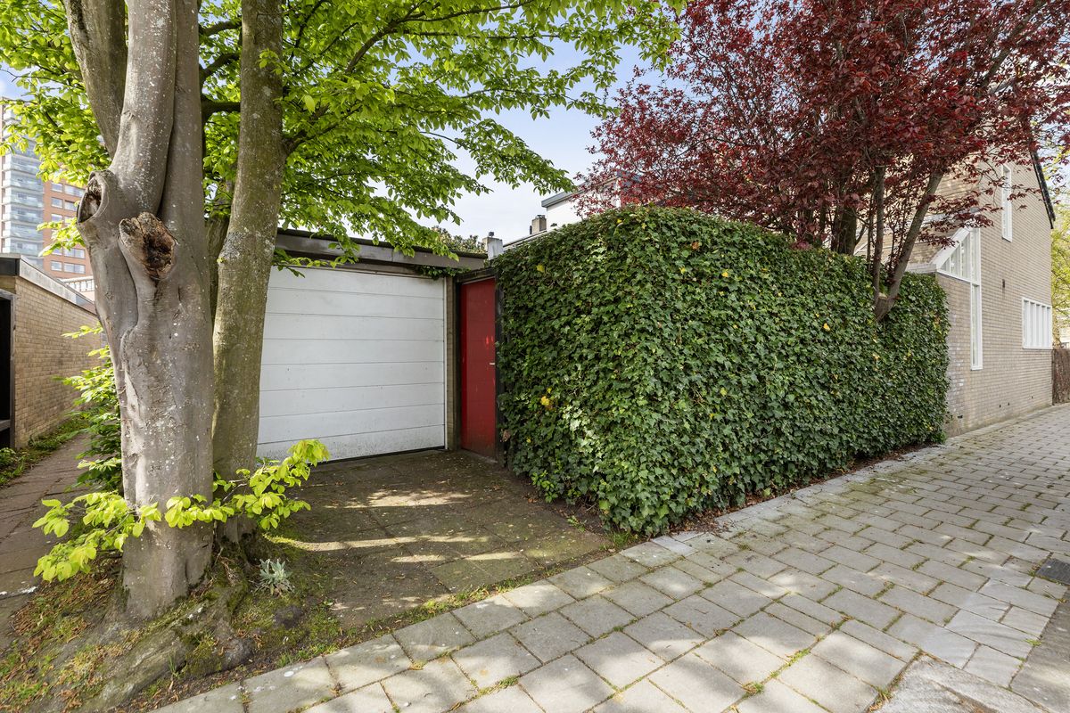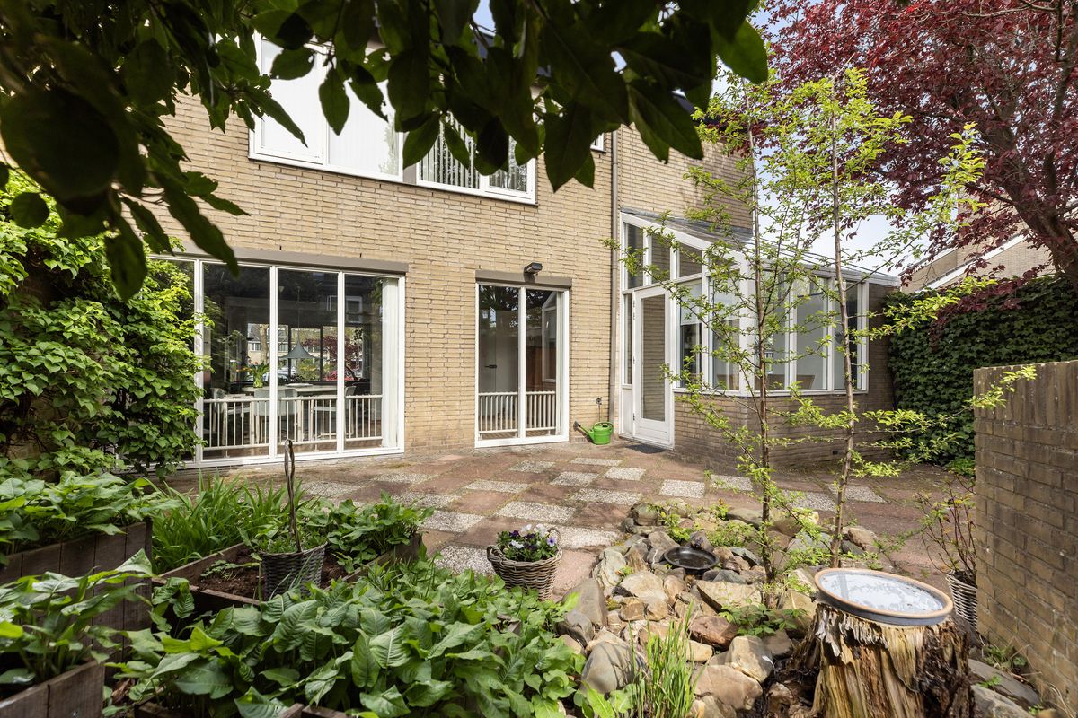 De tuin is verzorgd aangelegd, biedt veel privacy en beschikt over een achterom en een vrijstaande stenen garage met eigen oprit.