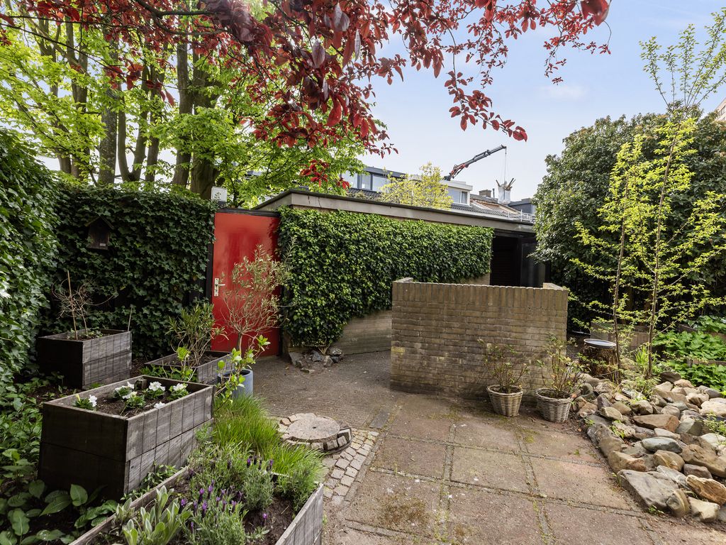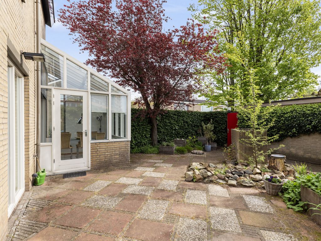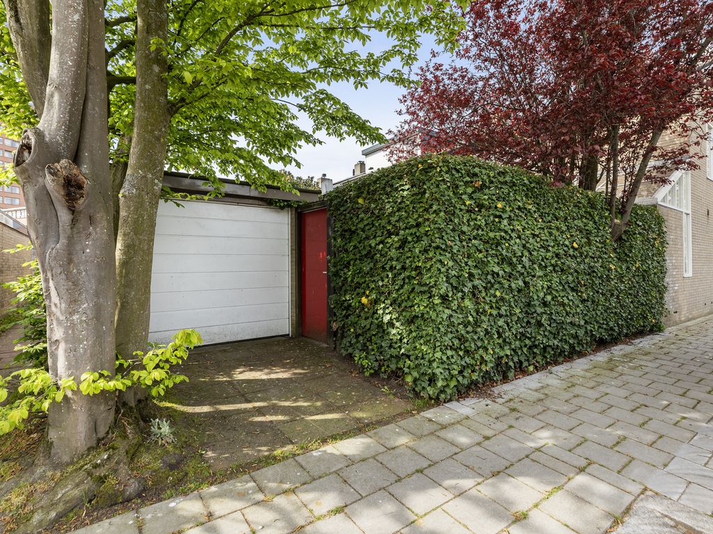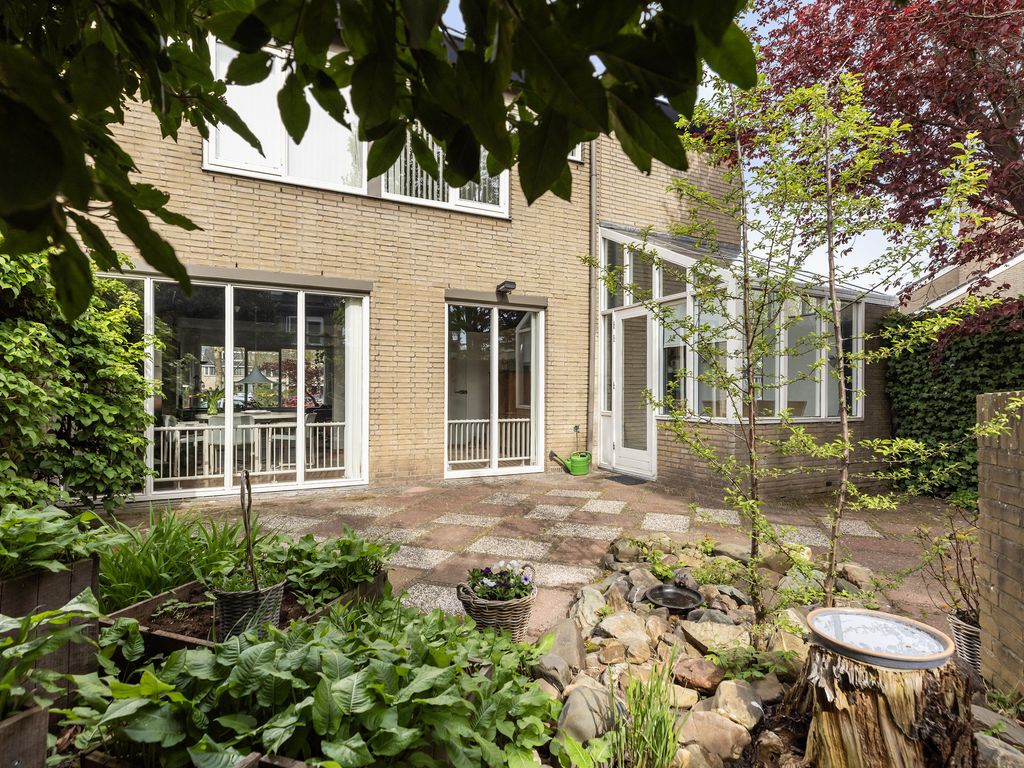 De tuin is verzorgd aangelegd, biedt veel privacy en beschikt over een achterom en een vrijstaande stenen garage met eigen oprit.