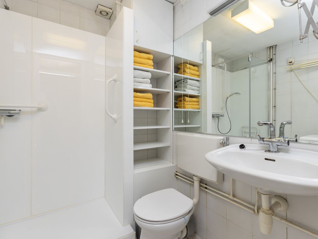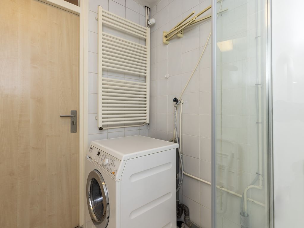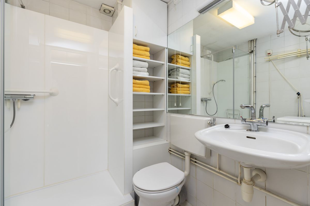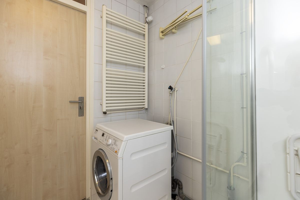De badkamer heeft een afmeting van ca. 2,20 x 2,05 m en is voorzien van een douche, wastafel, toilet en aansluiting voor de wasmachine.