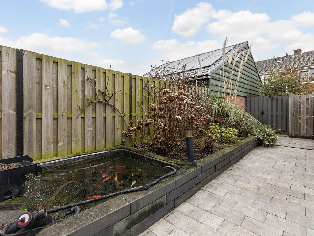 De tuin is onderhoudsvriendelijk aangelegd en beschikt over een stenen berging met overkapping, ideaal voor fietsen en extra opslag.