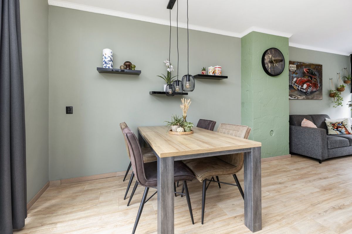 De wanden zijn afgewerkt met spachtelputz, het plafond is gestuct en op de vloer ligt een laminaatvloer, wat zorgt voor een verzorgde en warme uitstraling.