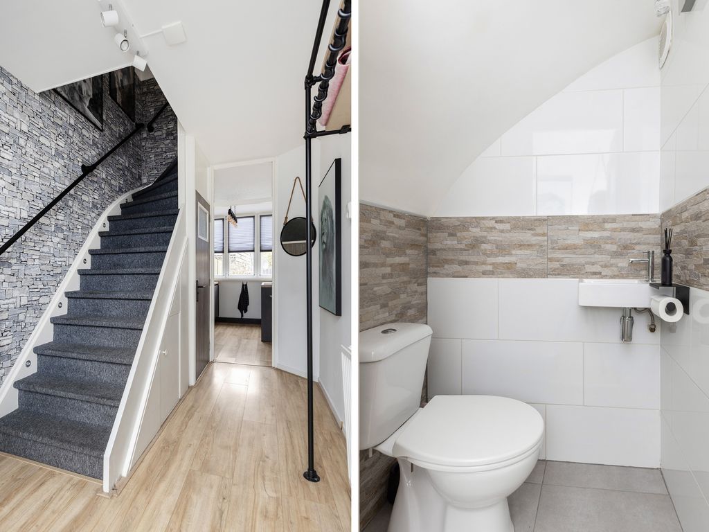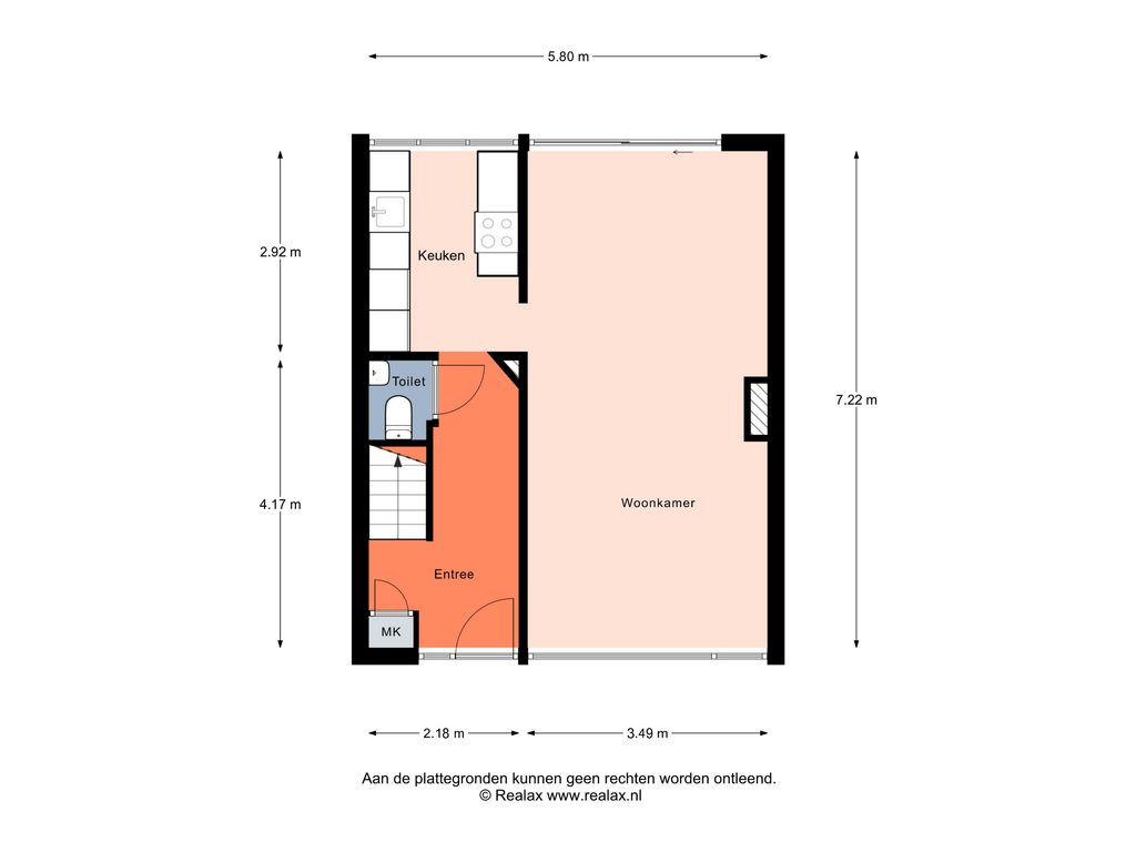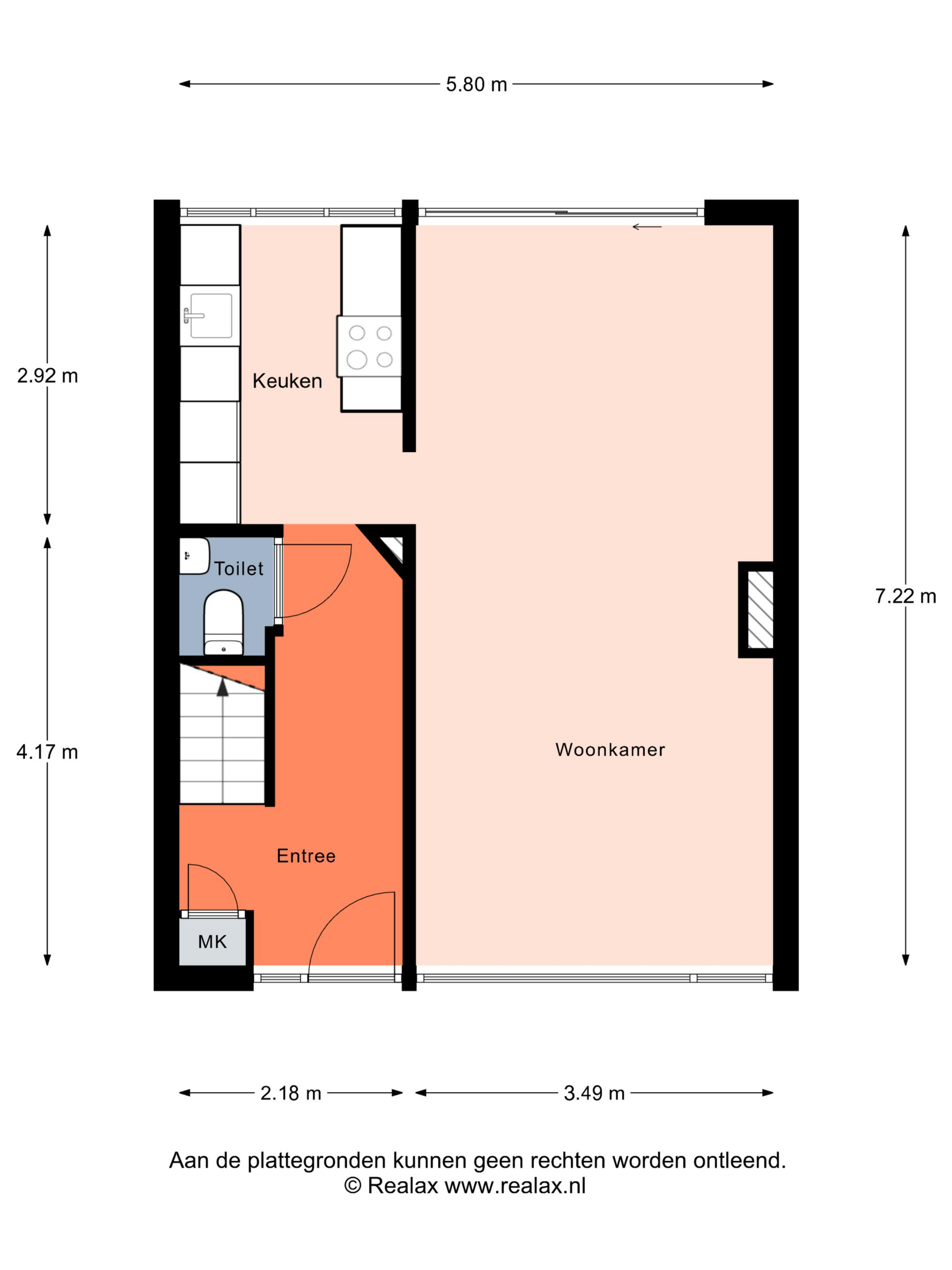 Via de entree kom je in de hal met toegang tot de toiletruimte, de meterkast, de trapopgang naar de eerste verdieping en de keuken met toegang tot de woonkamer.